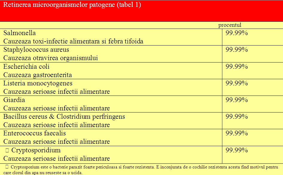 - Acest filtru ceramic retine 100% dintre microorganisme patogene aflate in apa cum ar fi: E. Colli, tifos, holera, salmonella, coliformi fecale, staphylococcus, enterococcus, cryptosporidium, etc (vezi tabel1) deoarece porii filtrului ceramic, sunt de 10 ori mai mici decat marimea microbilor din apa.