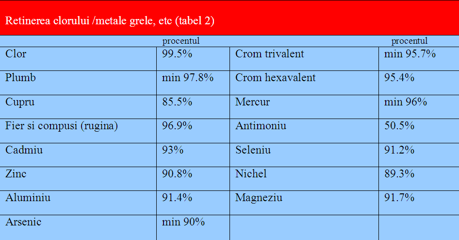 - Blocul de carbon continut in partea din interior al filtrului retine: chlorine, pesticides, phenols, toxic substances,amianthus fibers, hexavalent chromium, arsenic, lead si alte maerii grele( cele mai iportante le gasiti trecute in tabelul 2) in timp ce nu distruge si nu afecteaza elementele folositoare ale apei cum ar fi: saruri mierale, microutrienti etc.